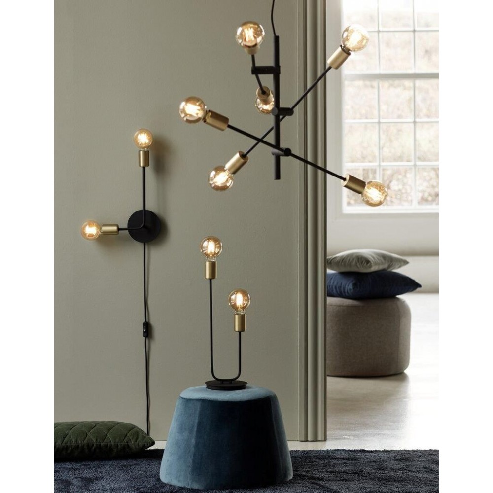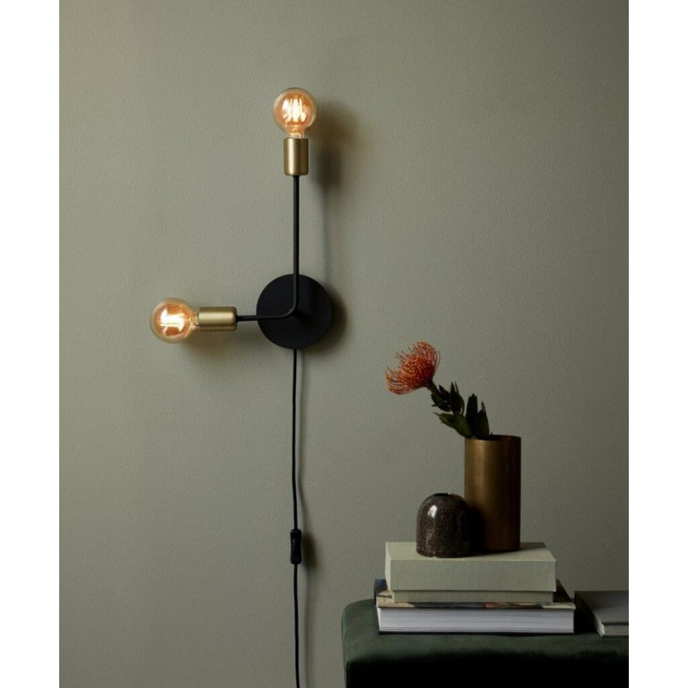 Επίτοιχο φωτιστικό απλίκα δίφωτο από μέταλλο σε χρώμα μαύρο ματ και λεπτομέρειες στο χρώμα του ορείχαλκου. Διαθέτει καλώδιο σε χρώμα μαύρο και μήκος 150εκ. Δέχεται δύο λαμπτήρες LED Ε27 με ισχύ έως 15W.