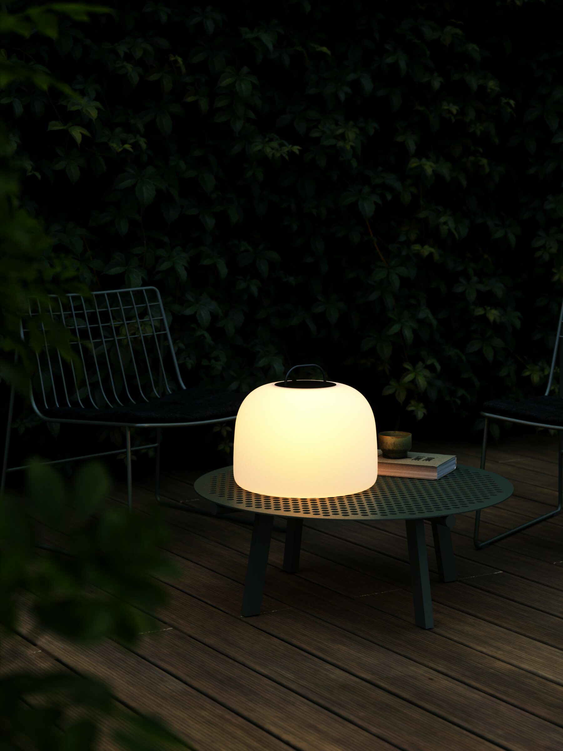 Το Kettle 36 είναι ένα όμορφο φωτιστικό που μπορεί να τοποθετηθεί ακριβώς όπου θέλετε. Κρεμάστε το στο δέντρο του κήπου με το παρεχόμενο κορδόνι ή τοποθετήστε το απευθείας στη βεράντα ή στο πάτωμα του σαλονιού. Μπορείτε να προσθέσετε μια ακίδα ή τρίποδο στην απόχρωση του φωτιστικού, που το μετατρέπει σε ακίδα, επιτραπέζιο ή επιδαπέδιο φωτιστικό. Το Kettle παράγεται από σκληρό πλαστικό και είναι ανθεκτικό στον αέρα και το νερό.