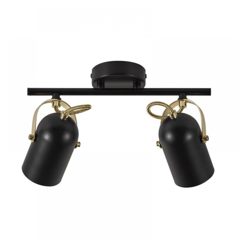 Φωτιστικό οροφής σποτ δίφωτο από μέταλλο σε χρώμα μαύρο και λεπτομέρειες στο χρώμα του ορείχαλκου με δυνατότητα κίνησης των ντουί. Διαθέτει δύο λαμπτήρες LED Ε14 με ισχύ έως 12W.
