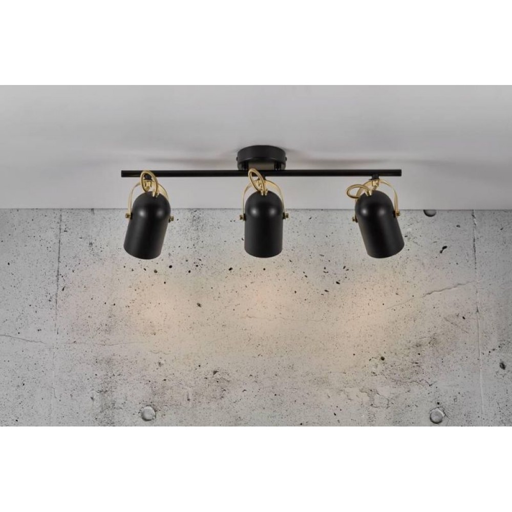 Φωτιστικό οροφής σποτ τρίφωτο από μέταλλο σε χρώμα μαύρο και λεπτομέρειες στο χρώμα του ορείχαλκου με δυνατότητα κίνησης των ντουί. Διαθέτει τρείς λαμπτήρες LED Ε14 με ισχύ έως 12W.