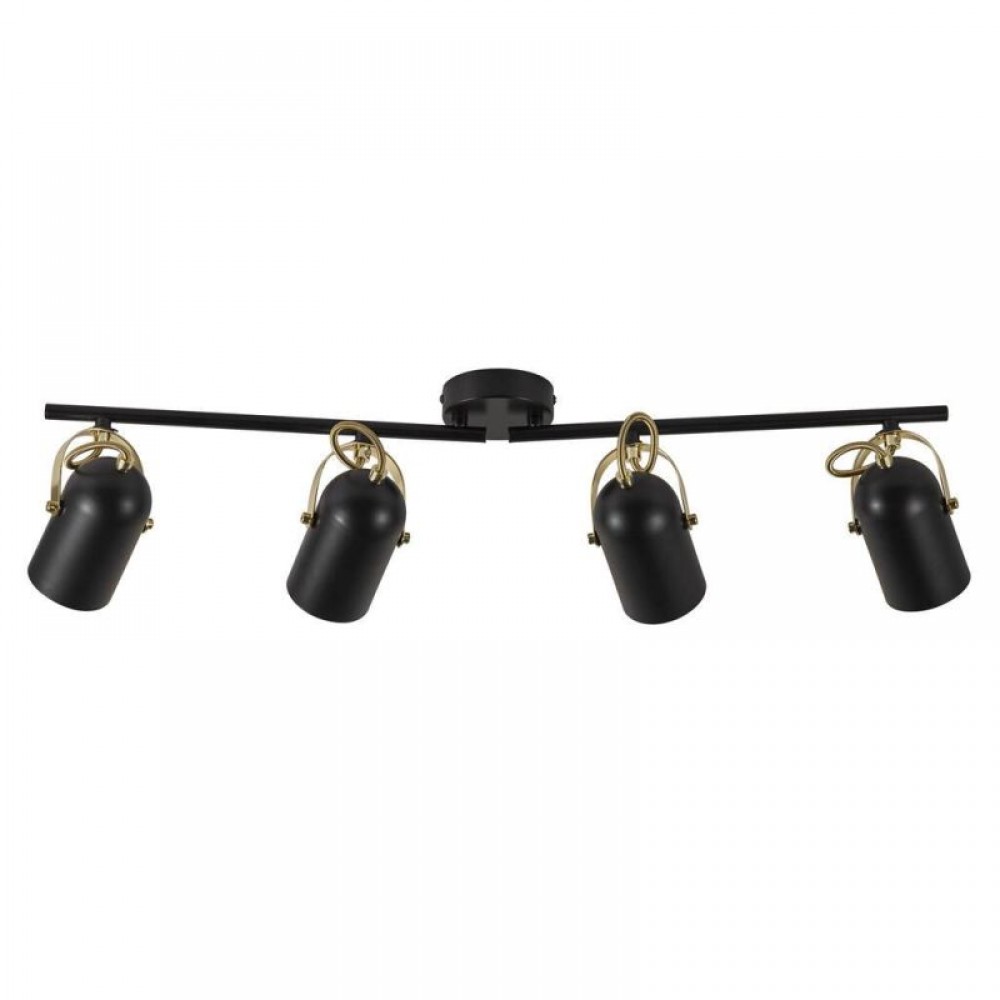 Φωτιστικό οροφής σποτ τετράφωτο από μέταλλο σε χρώμα μαύρο και λεπτομέρειες στο χρώμα του ορείχαλκου με δυνατότητα κίνησης των ντουί. Διαθέτει τέσσερις λαμπτήρες LED Ε14 με ισχύ έως 12W.