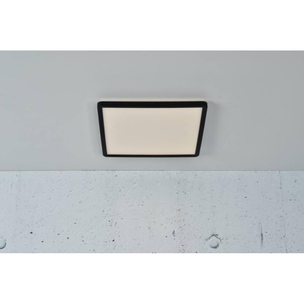 Φωτιστικό οροφής πλαφονιέρα σε τετράγωνο σχήμα από πλαστικό σε χρώμα μαύρο με βαθμό στεγανότητας IP 54 και δυνατότητα επιλογής φωτισμού. Διαθέτει ενσωματωμένο LED με ισχύ 14,5W και απόδοση 1600 Lumen σε θερμό λευκό χρώμα 3000Κ και ουδέτερο 4000Κ.