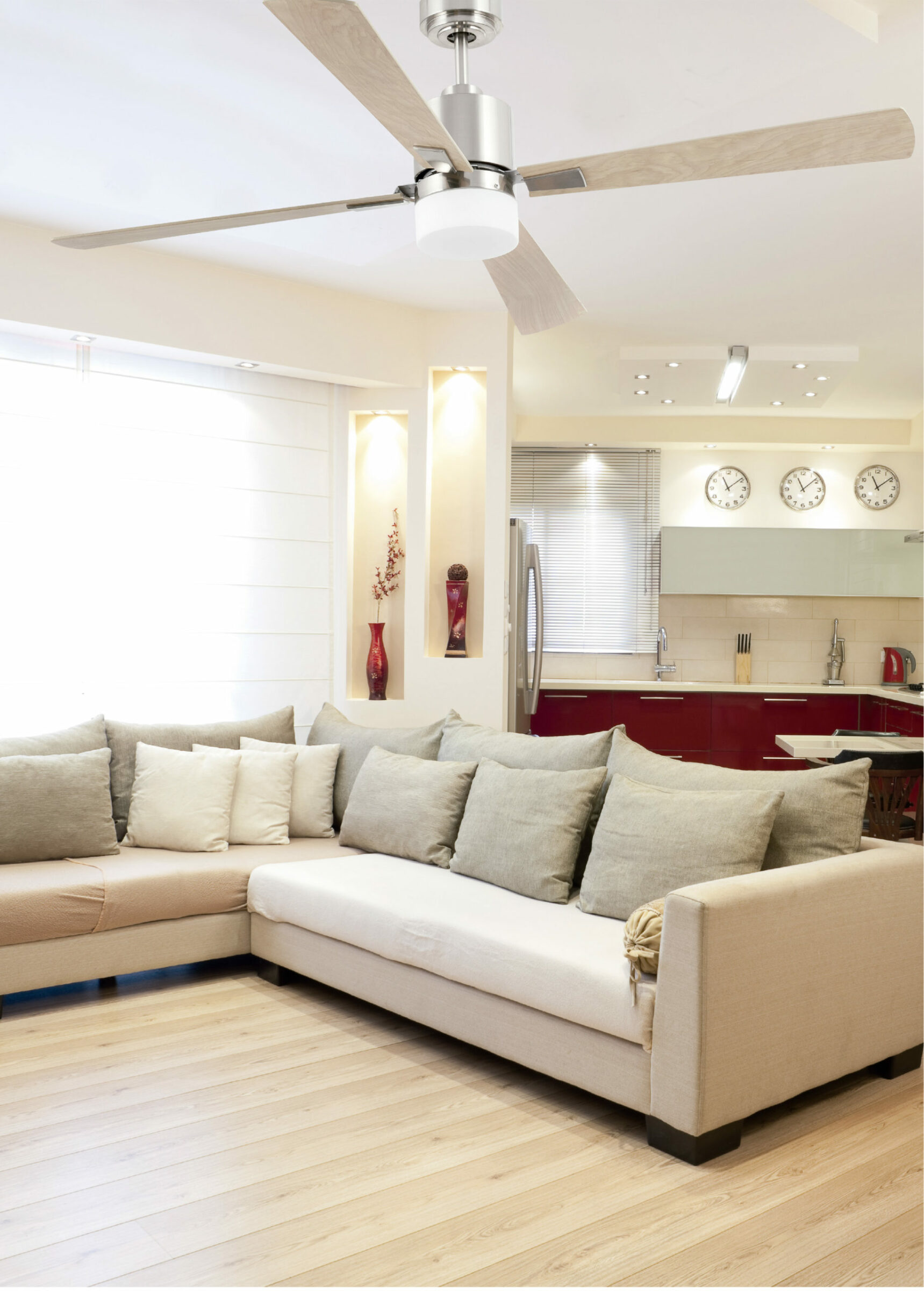 Modern ceiling fan with DC motor suitable for rooms from 17,6m2. Motor made from steel and blades from wood with an opal glass difusser.The color of blades are maple, no reversibles.Operated by remote control,( included) setted up with 4 dimmable speeds 50-77-104-131-158-185 rpm which correspond to the following consumptions of 3-5-8-13-21-32w.This ceiling fan has winter / summer function. Suitable for incling room.