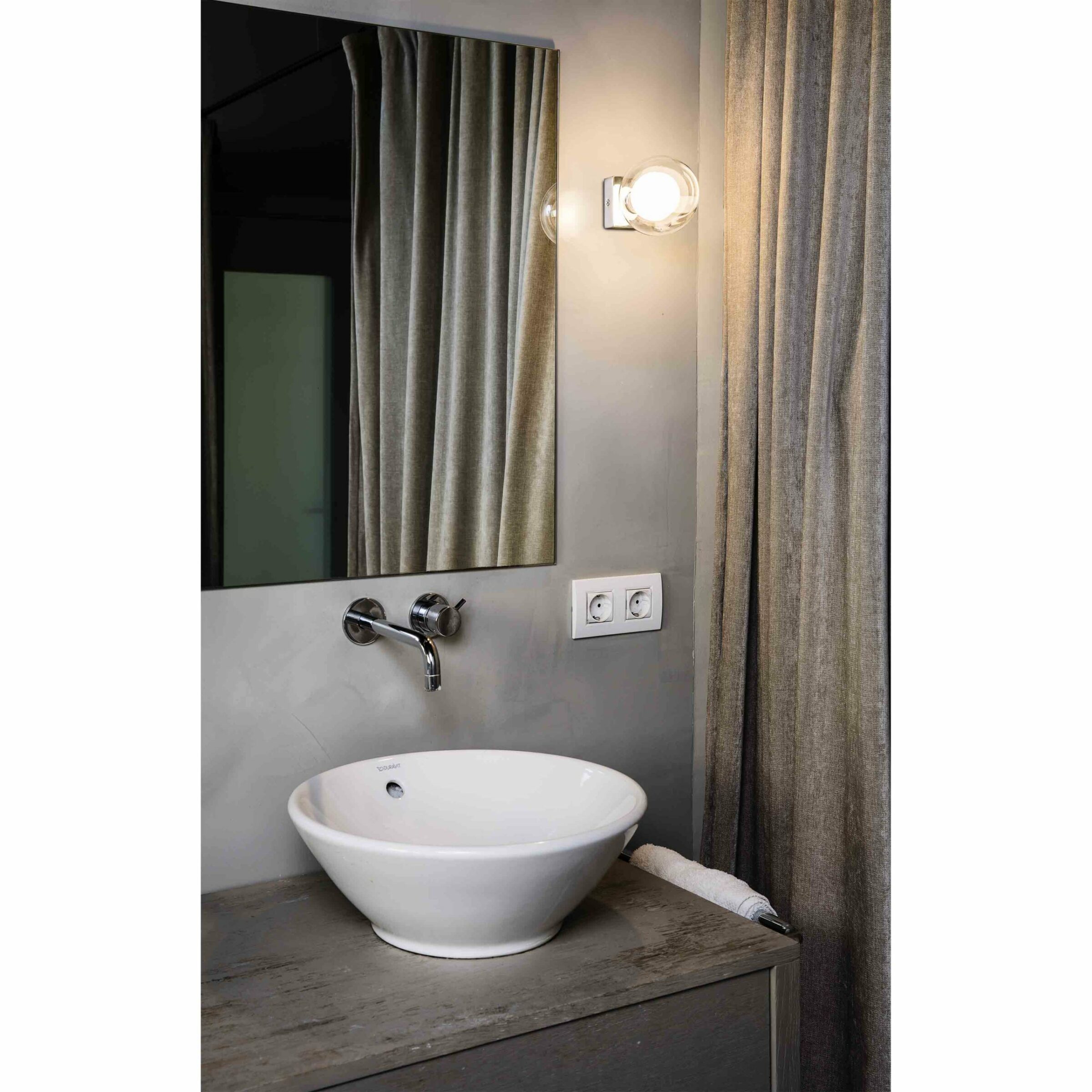 Bathroom wall lamp designed by Alex&Manel Lluscà. PERLA is a round shaped light with a transparent exterior diffusor that is reminiscent of a bubble. This wall light in chrome finish is ideal for lighting a mirror .