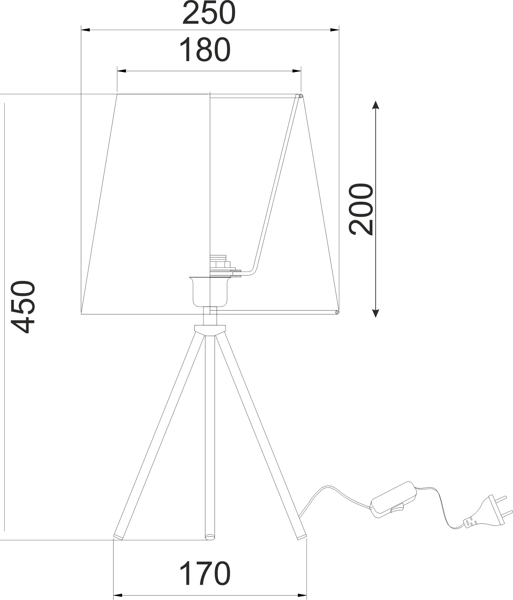 Metallic table lighting fixture with tripod amount and fabric shade lined inside with white cover. Switch on the cable.