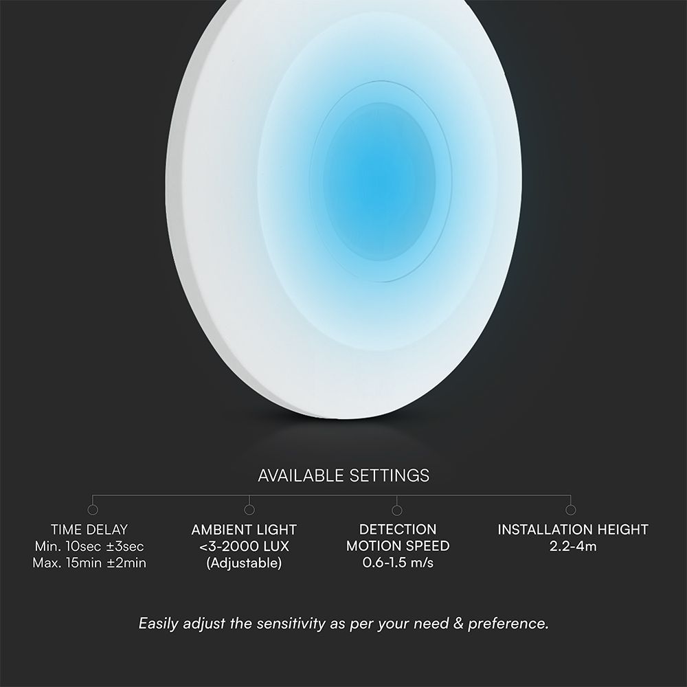 Ο αισθητήρας έχει μοντέρνο λευκό σώμα από PC, που συνδυάζεται αρμονικά με τα περισσότερα φωτιστικά και εσωτερικές διακοσμήσεις, και εύκολη εγκατάσταση επιφανειακής τοποθέτησης στην οροφή ή τον τοίχο. Ιδανικός για ενεργειακή εξοικονόμηση, αυτοματισμό χώρων και βελτιστοποίηση χρήσης φωτισμού με μεγάλη αξιοπιστία και ανθεκτικότητα.
