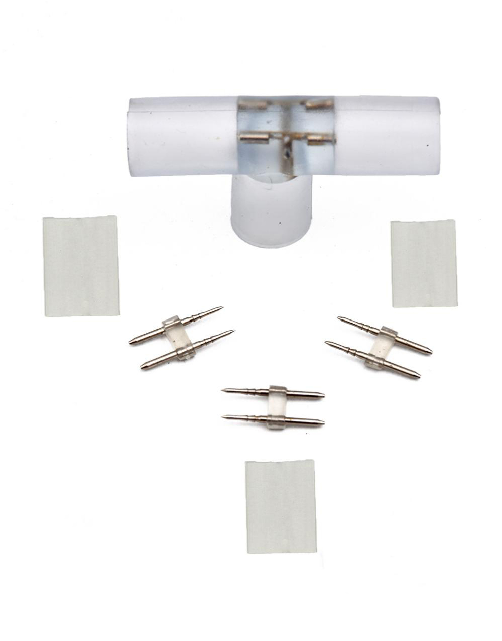 Σύνδεσμος Τ 2 επαφών για Round led ταινία. Στην συσκευασία περιλαμβάνονται 3 θερμοσυστελλόμενα και 3 pin 2 επαφών.