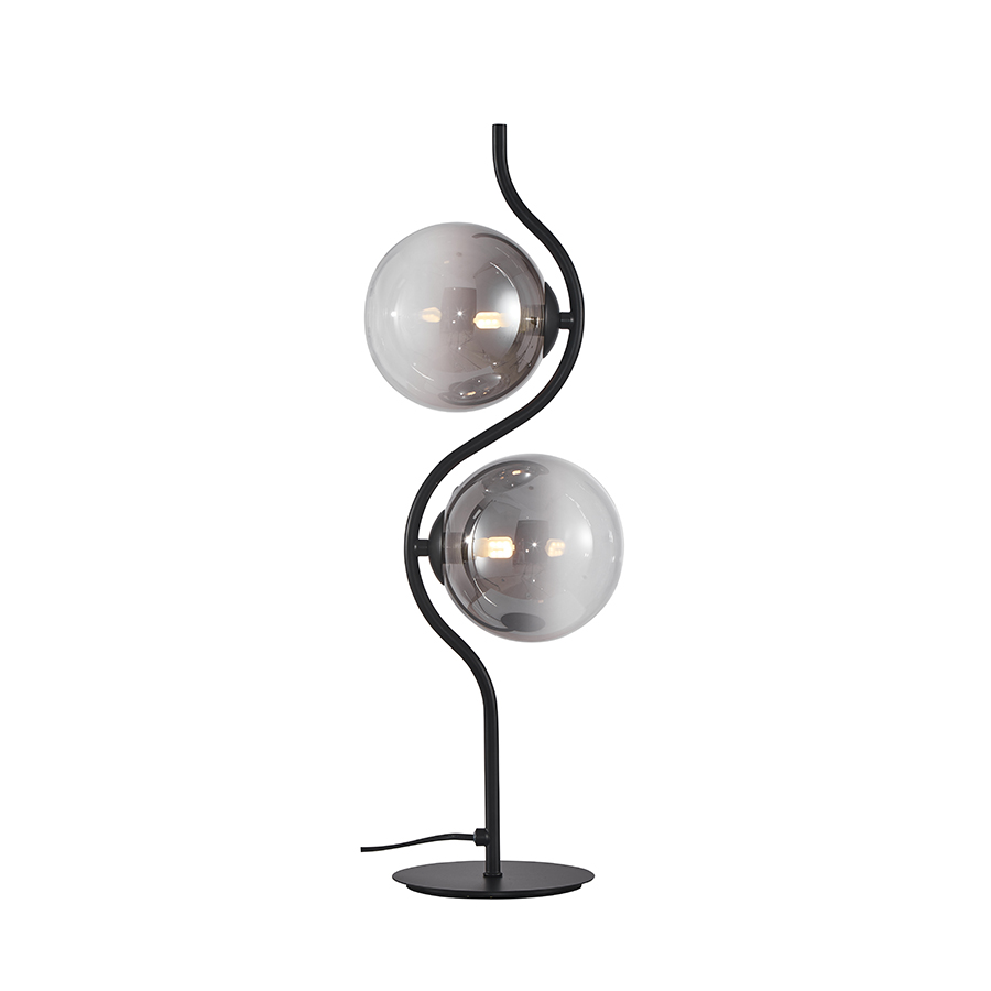 Επιτραπέζιο δίφωτο φωτιστικό, κατασκευασμένο από χειροποίητο γυαλί smoked και μεταλλικό σκελετό σε μαύρο χρώμα.