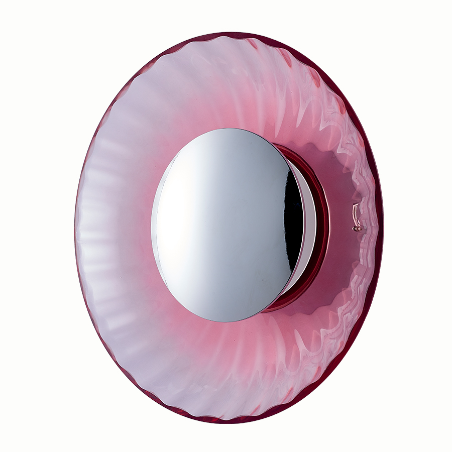 Φωτιστικό τοίχου κατασκευασμένο από χειροποίητο γυαλί χρώματος ροζ με μεταλλικά στοιχεία στο χρώμα του χρωμίου. Διαθέτει ενσωματωμένο LED με θερμό χρώμα (3000Κ).