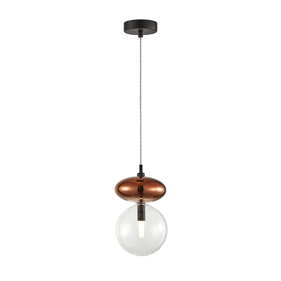 Μονόφωτο κρεμαστό φωτιστικό κατασκευασμένο από χειροποίητο γυαλί σε αποχρώσεις διάφανου και χαλκού με μαύρα μεταλλικά στοιχεία.