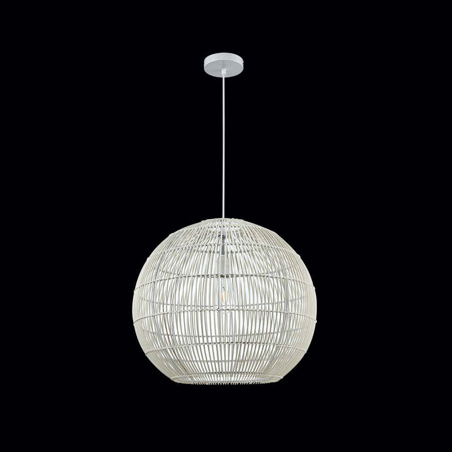 Κρεμαστό μονόφωτο φωτιστικό κατασκευασμένο από rattan σε λευκό χρώμα.