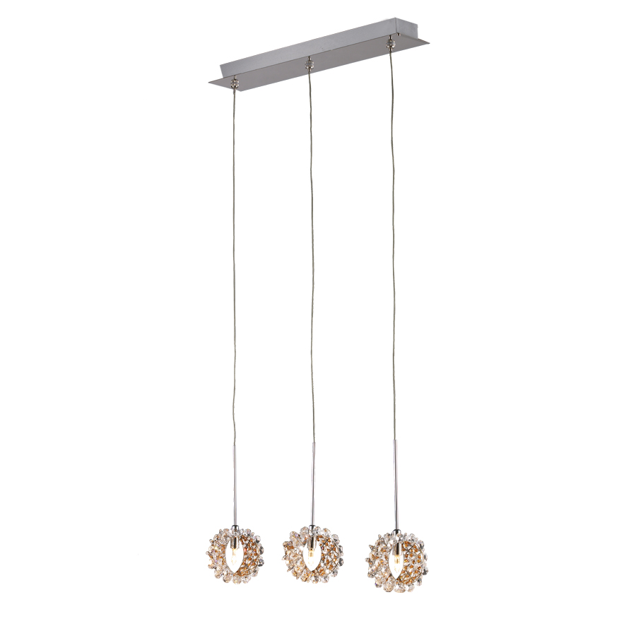 Εντυπωσιακό κρεμαστό φωτιστικό(τρίφωτη ράγα) με βάση από χρώμιοκαι διακοσμημένο με λευκά και μελί κρύσταλλα.Ύψος: 100 εκ.Μήκος: 50 εκ.Πλάτος: 8 εκ.Λαμπτήρες: 3 τεμ.Τύπος Λαμπτήρα: G4Watt: 35