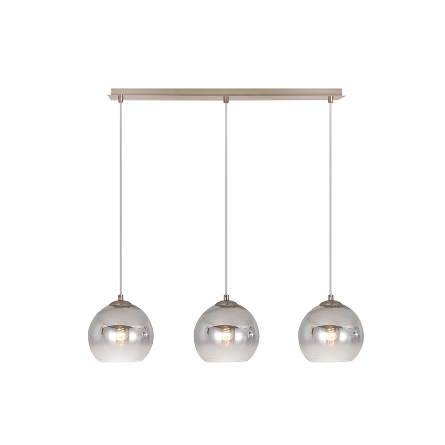 Τρίφωτο κρεμαστό φωτιστικό σε ράγα κατασκευασμένο από χειροποίητα γυαλιά χρώμιο ντεγκραντέ και μεταλλική βάση σε νίκελ ματ σατινάτο.Ύψος: 120 εκ.Διάμετρος Γυαλιού : 18 εκ.Μήκος: 70 εκ.Λαμπτήρες: 3 τεμ.Τύπος Λαμπτήρα: Ε27Watt: 60