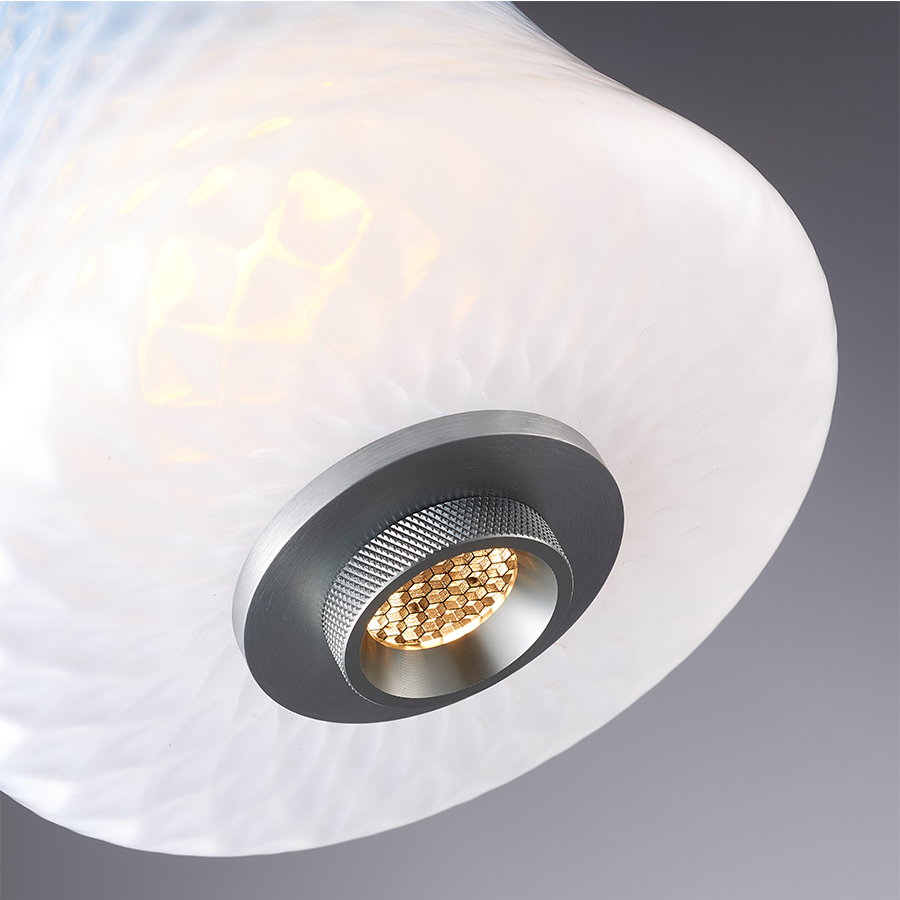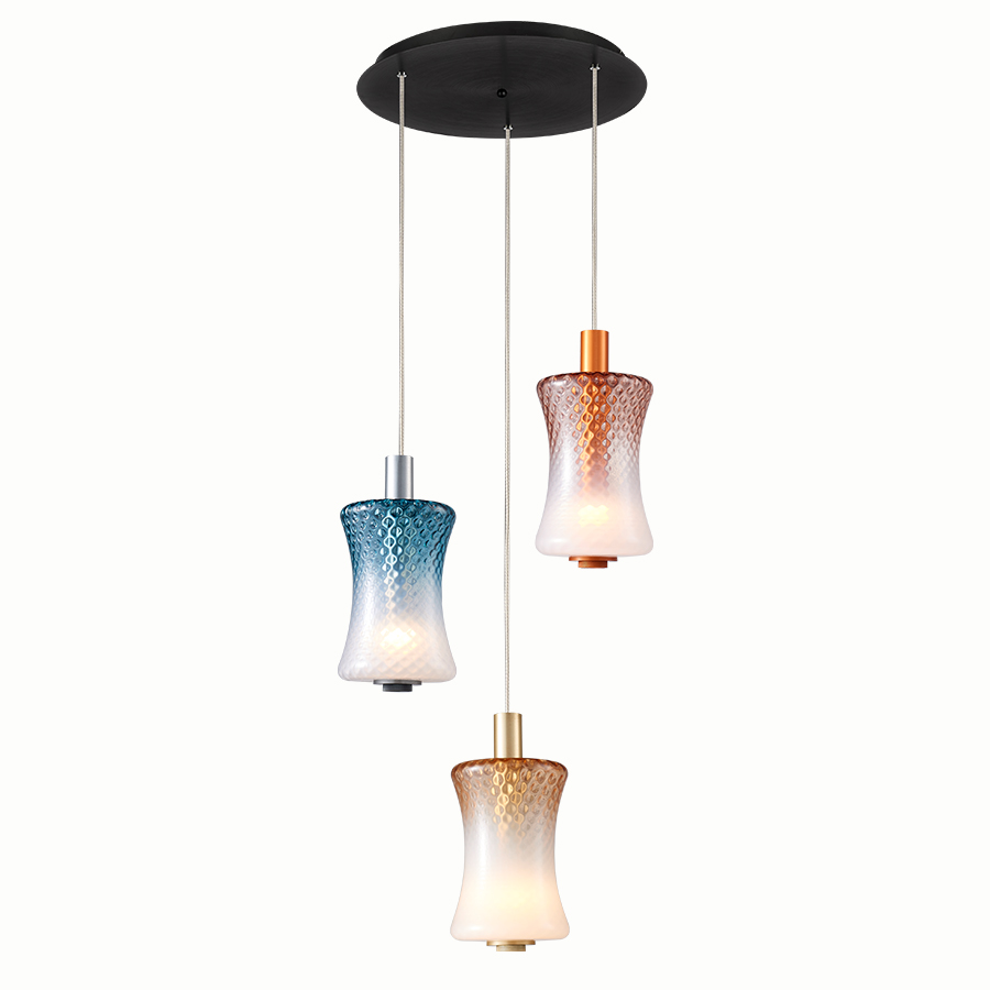 Τρίφωτο κρεμαστό φωτιστικό σε ροζέτα κατασκευασμένο από χειροποίητα γυαλιά σε μπλέ, μελί και απαλό ροζ χρώμα και μεταλλική βάση σε μαύρο χρώμα.