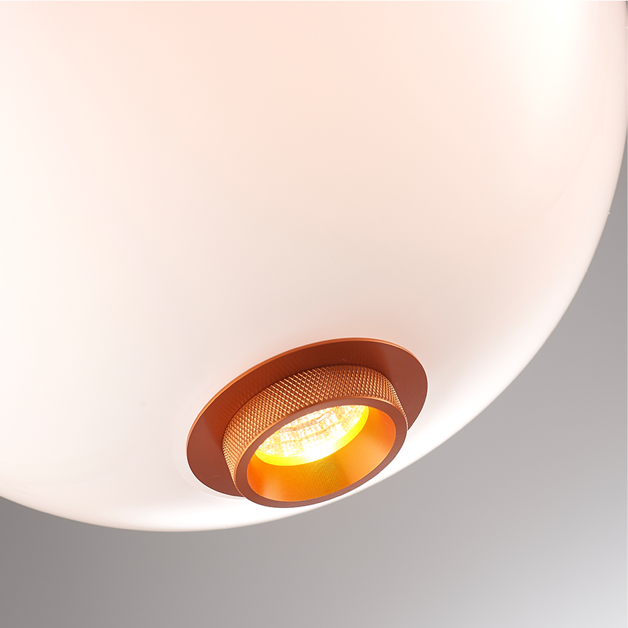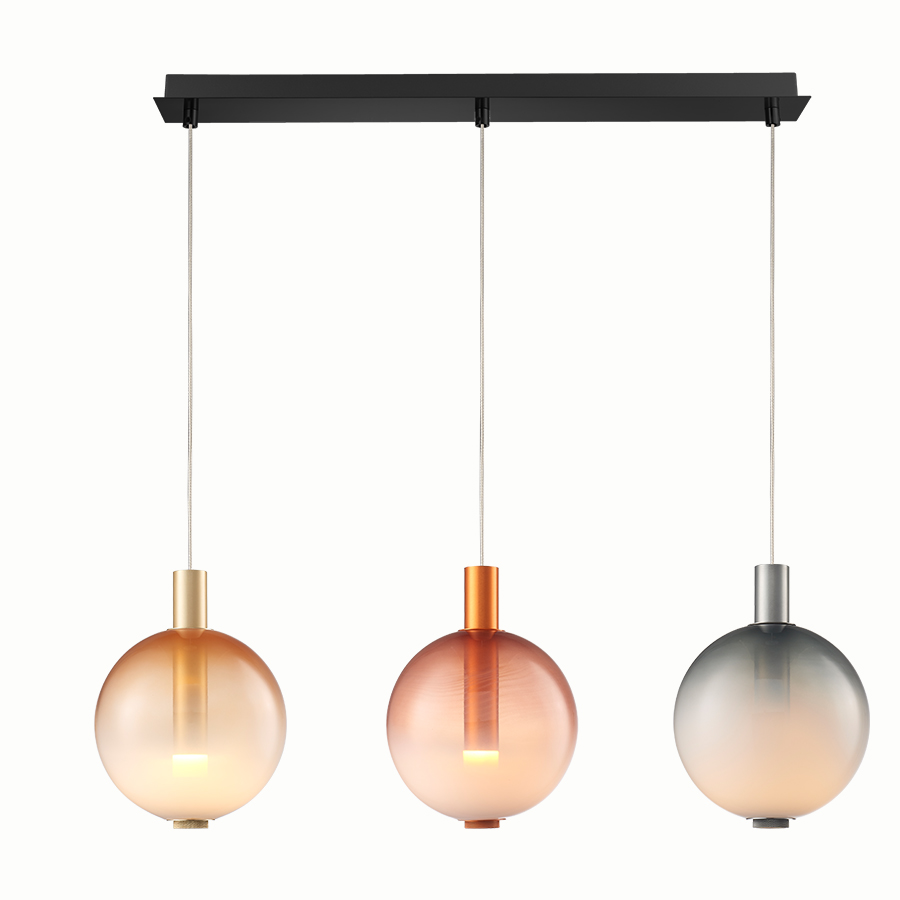 Τρίφωτο κρεμαστό φωτιστικό σε ράγα κατασκευασμένο από χειροποίητα γυαλιά σφουμάτα σε γκρι, μελί και απαλό ροζ χρώμα και μεταλλική βάση σε μαύρο χρώμα.