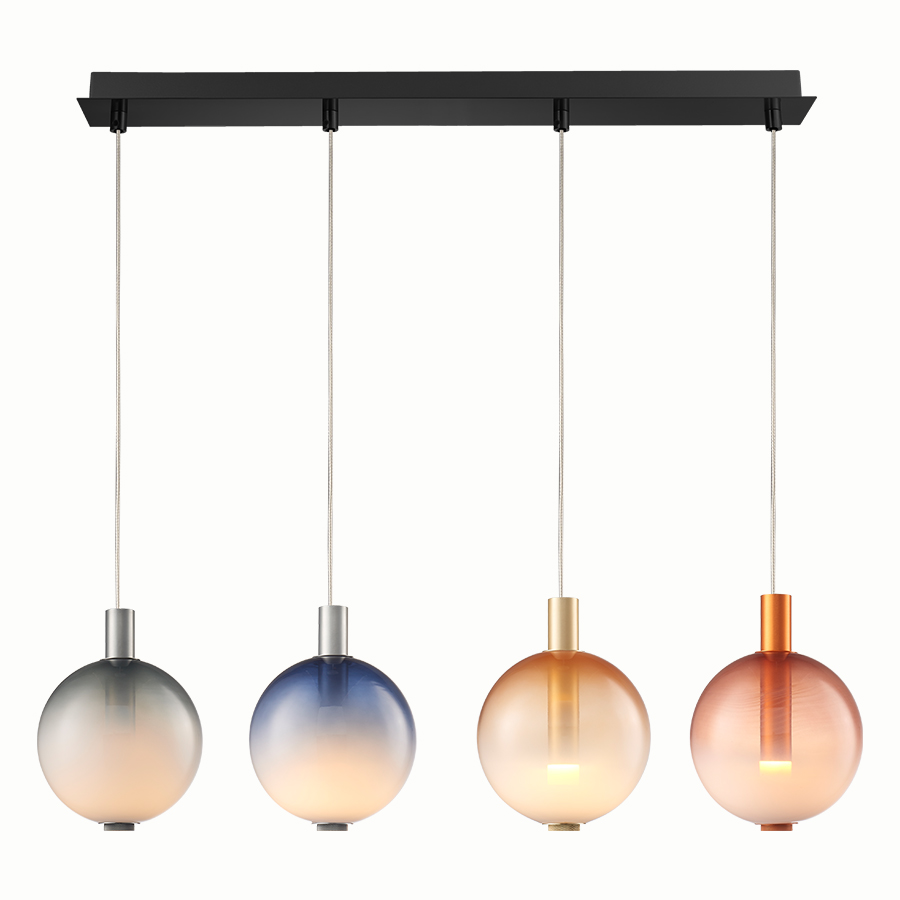 Τρίφωτο κρεμαστό φωτιστικό σε ράγα κατασκευασμένο από χειροποίητα γυαλιά σφουμάτα σε γκρι, μπλε, μελί και απαλό ροζ χρώμα και μεταλλική βάση σε μαύρο χρώμα.