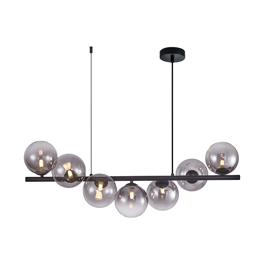 Πολύφωτο-κρεμαστό φωτιστικό, επτάφωτη ράγα,  κατασκευασμένη από χειροποίητο γυαλί smoked και μεταλλικό  σκελετό σε μαύρο χρώμα.