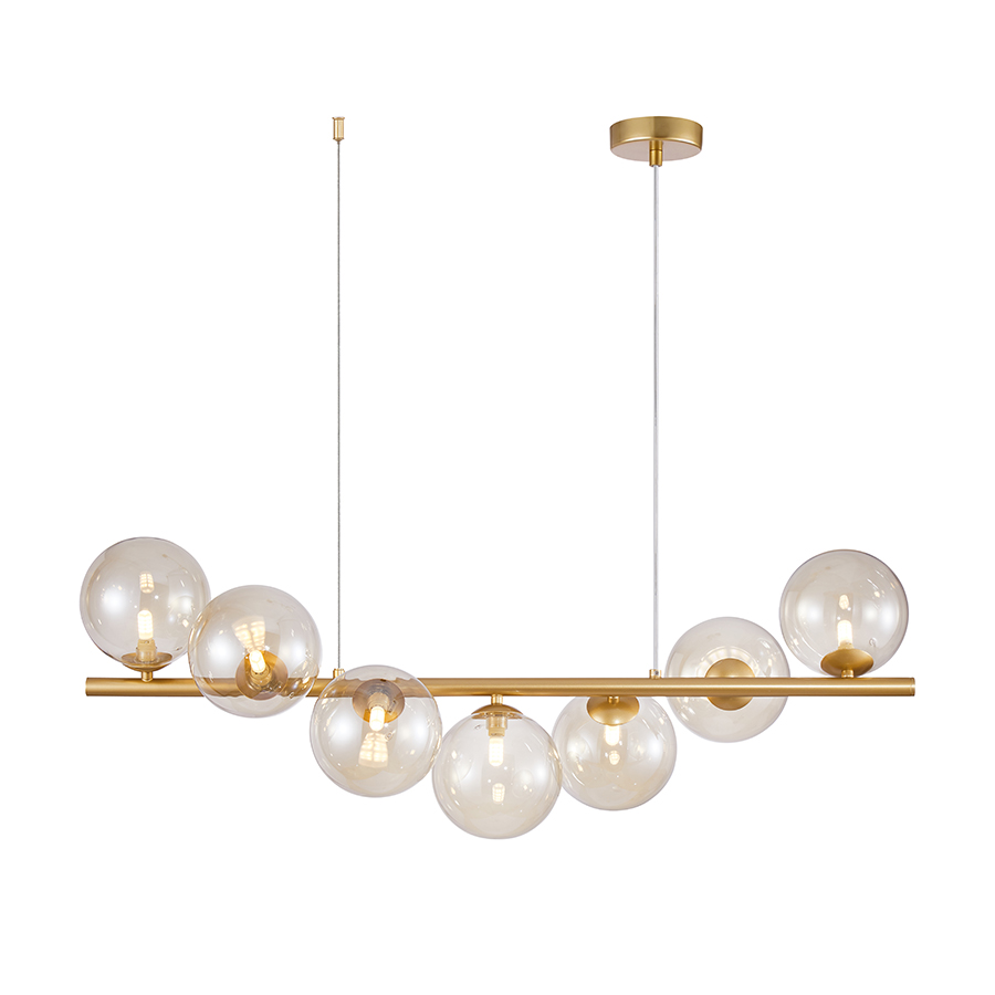 Πολύφωτο-κρεμαστό φωτιστικό, επτάφωτη ράγα, κατασκευασμένη από χειροποίητο γυαλί cognac και μεταλλικό σκελετό σε χρυσό χρώμα.