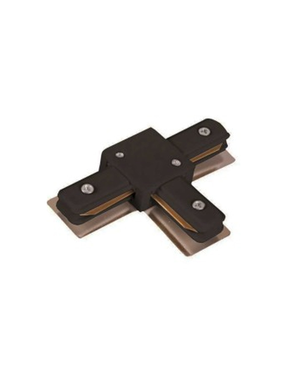 Σύνδεσμος Τ για μονοφασική ράγα Universe. Είναι από πλαστικό και χάλκινο υλικό σε μαύρο χρώμα.