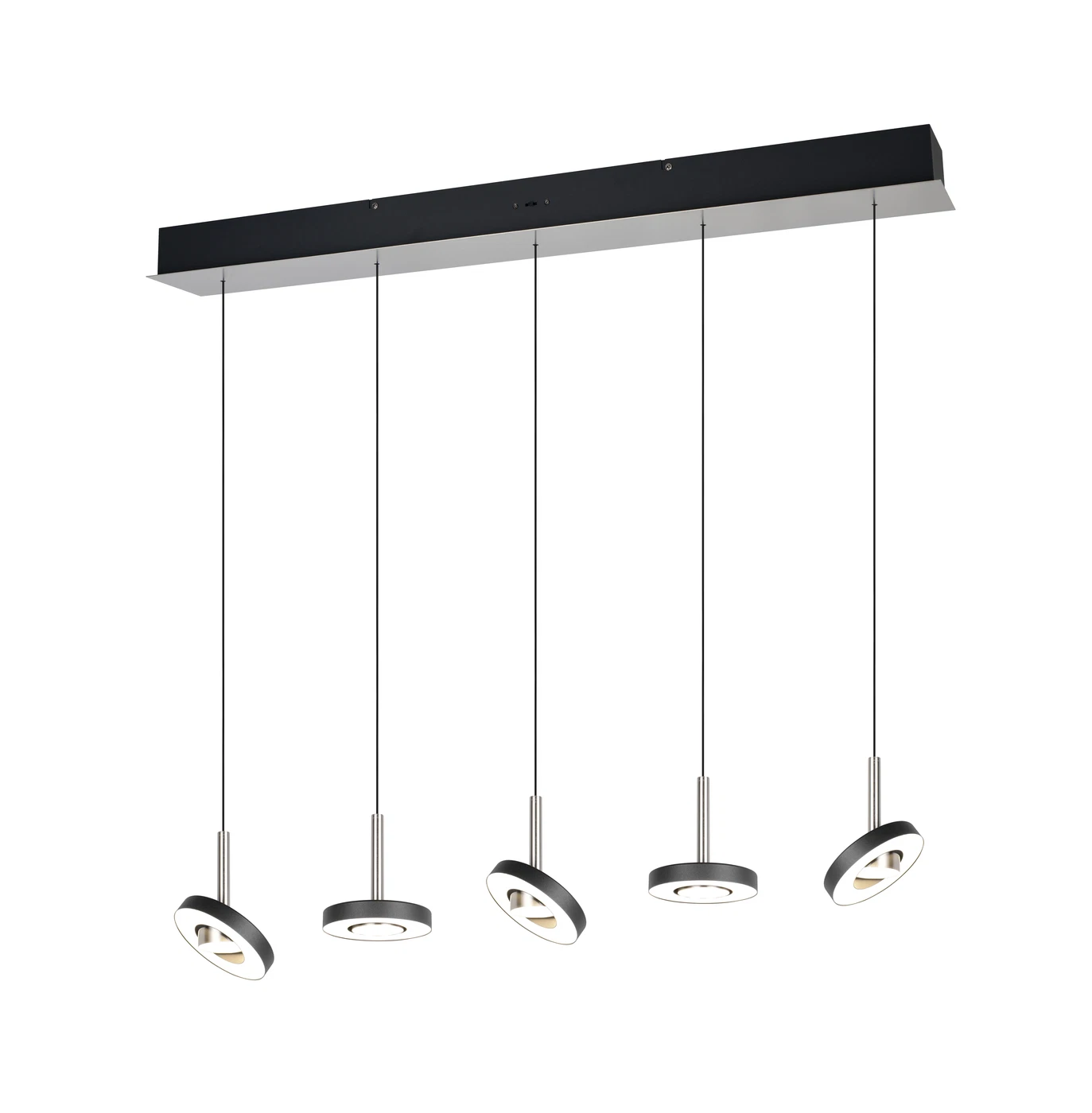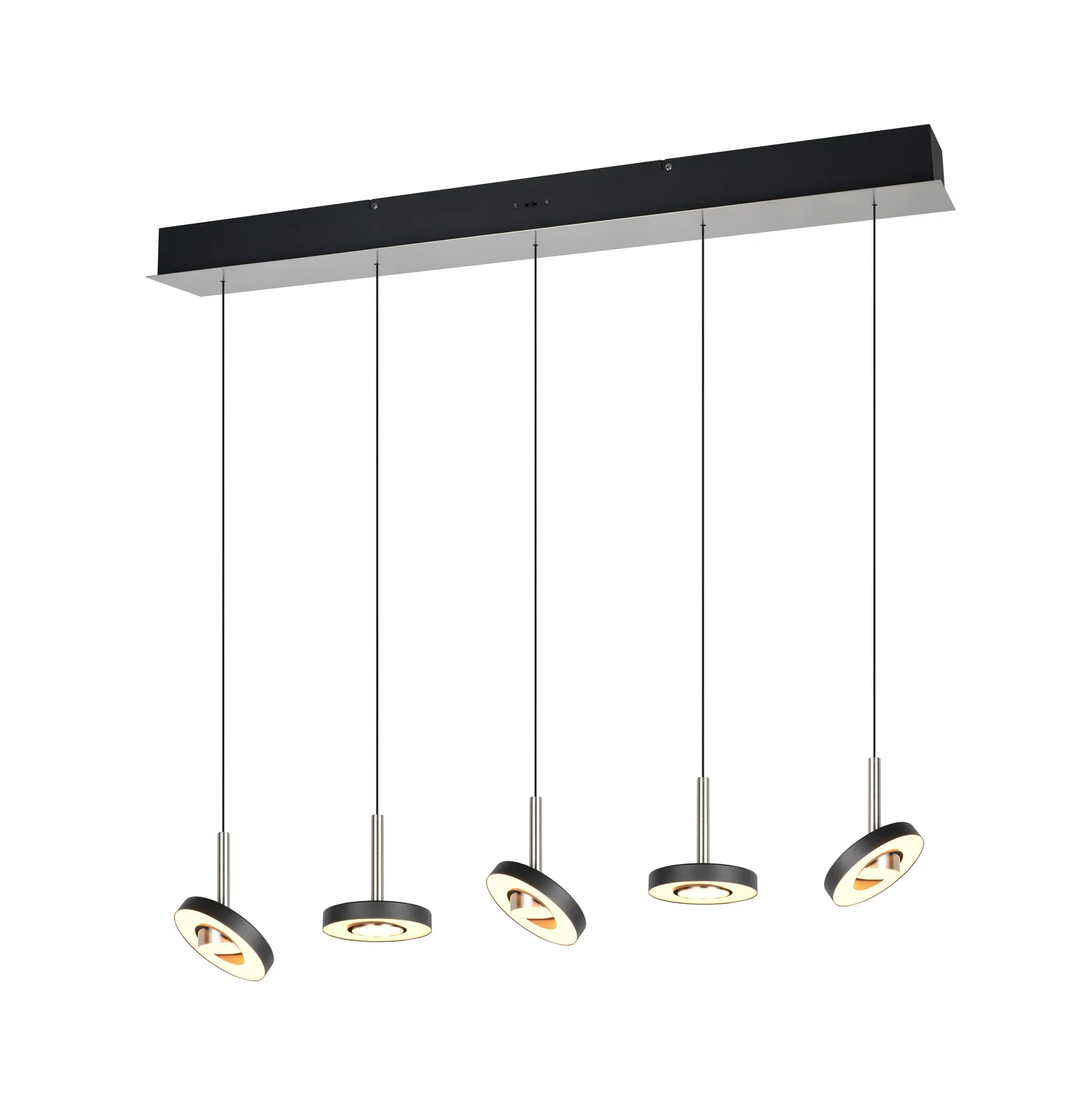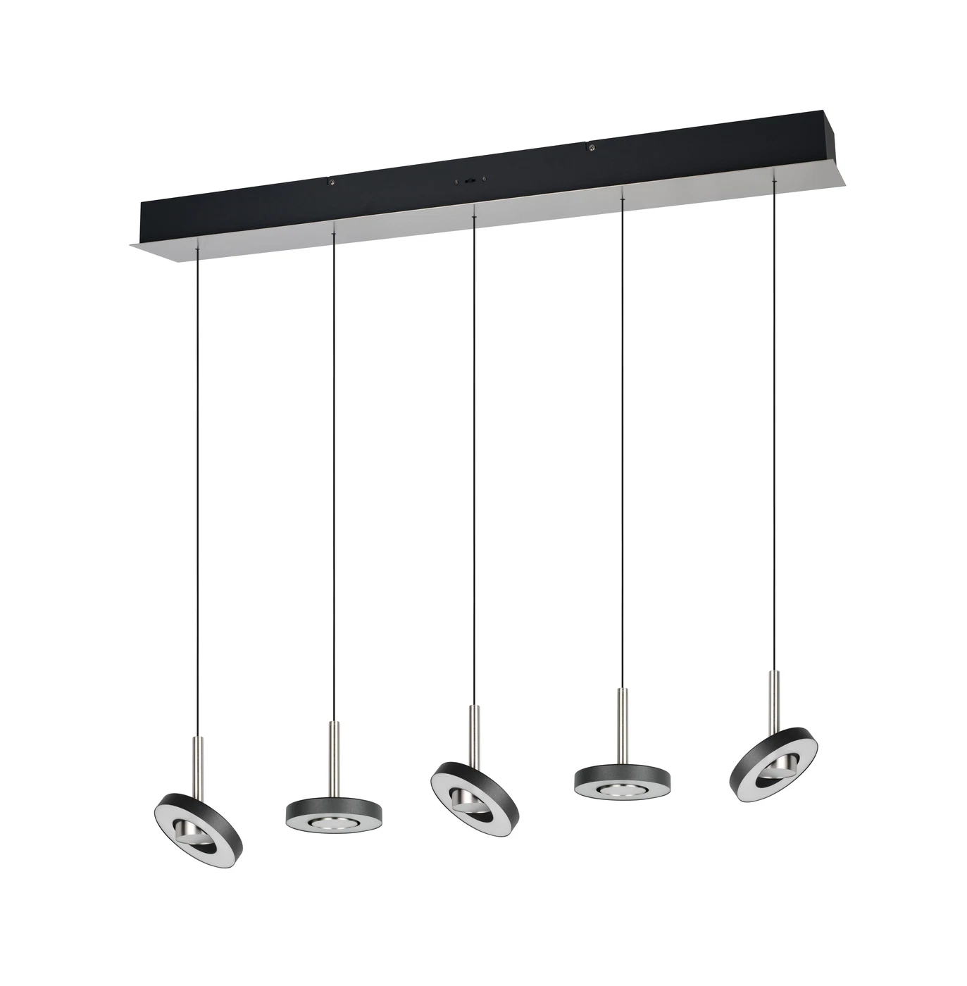 Το TRIO Lighting GUANO 334410507 είναι ένα σύγχρονης αισθητικής κρεμαστό φωτιστικό οροφής LED που συνδυάζει ισχυρό φωτισμό με μινιμαλιστικό design. Με πέντε ενσωματωμένα LED των 8 W, αποδίδει συνολικά περίπου 4250 lm, προσφέροντας καθαρό και ομοιόμορφο φωτισμό που είναι ιδανικός για σαλόνι, τραπεζαρία ή καθιστικό χώρους όπου ο φωτισμός πρέπει να καλύπτει μεγάλη επιφάνεια με άνεση.