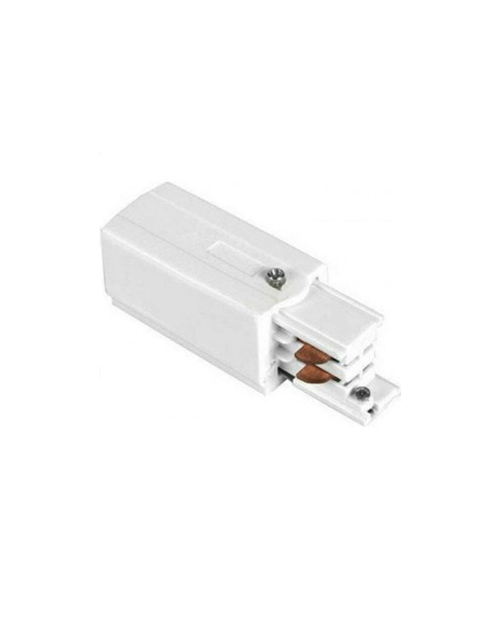 Τροφοδοτικό για τριφασική ράγα Universe. Είναι από πλαστικό και χάλκινο υλικό σε λευκό χρώμα.
