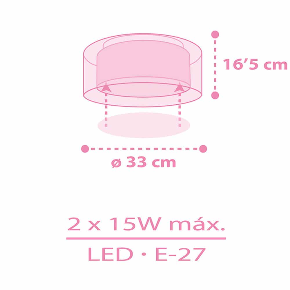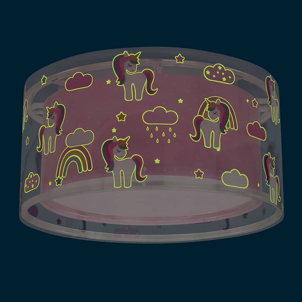 Παιδικό φωτιστικό οροφής τύπου πλαφονιέρα κατάλληλο για γενικό φωτισμό και όλες τις δραστηριότητες των παιδιών. Είναι διπλού τοιχώματος από άκαυστο λεπτό πολυπροπυλένιο και φωσφορίζοντα στο σκοτάδι εξωτερικά μέρη. Τοποθετείται εύκολα και γρήγορα και είναι εφοδιασμένο με δύο θέσεις λαμπτήρων LED για πραγματικά άπλετο φως στο δωμάτιο. Παρέχεται διαχυτής φωτός για τις μικρότερες ηλικίες που προσφέρει ομοιόμορφο φωτισμό αλλά και προστασία. Κατασκευασμένο εξ ολοκλήρου στην Ευρώπη το Unicorns πλαφονιέρα οροφής, συμπληρώνει τα υπόλοιπα παιδικά φωτιστικά της συλλογής κομοδίνου, απλίκα ή νυκτός.