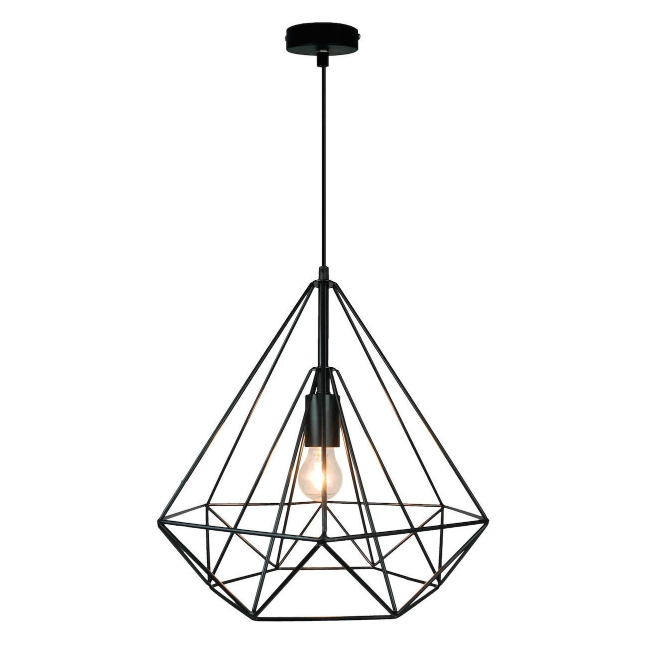 Μεταλλικό κρεμαστό φωτιστικό εσωτερικής διακόσμησης χώρου, σε ιδιαίτερο σχέδιο σύγχρονης αισθητικής. Θα αλλάξει το ύφος κάθε χώρου και αμέσως θα τον μετατρέψει σε ένα μοντέρνο ξεχωριστό δωμάτιο. Για έναν λαμπτήρα 40W E27, τον οποίο προμηθεύεστε χωριστά. Γεωμετρικά σχέδια σε μαύρο χρώμα φλερτάρει με το βιομηχανικό διακοσμητικό ύφος. Ύψος 1000mm, ύψος κυρίως μέρους χωρίς την ανάρτηση 270mm, πλάτος 280mm.