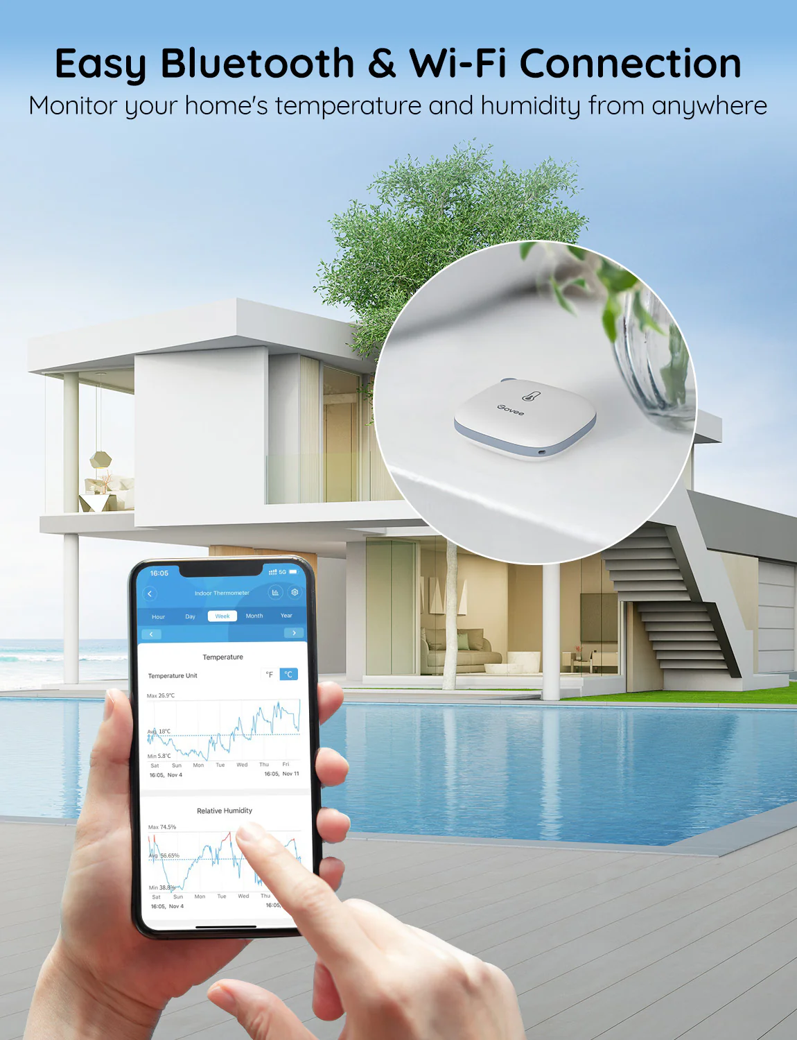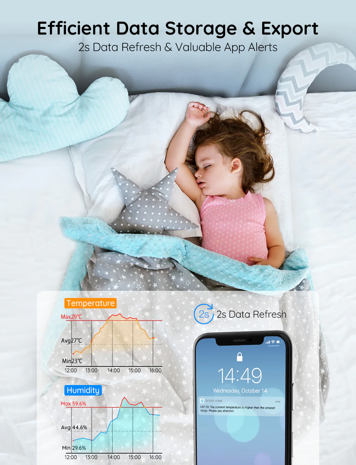 - Αισθητήρας υψηλής ακρίβειας: Η ακρίβεια θερμοκρασίας είναι ±0,3℃ και η ακρίβεια υγρασίας είναι ±3%RH. Με ανανέωση κάθε 2 δευτερόλεπτα, θα παραμένετε πάντα ενημερωμένοι.